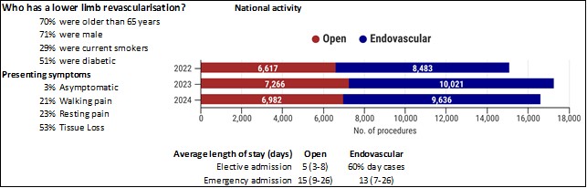 - 6,982 bypass or open procedures recorded (4,089 elective and 2,893 non-elective). Of these, 2,453 were hybrid revascularisations.