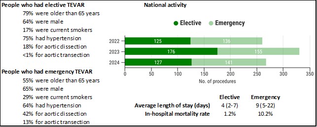In 2022-24, in-hospital postoperative mortality rates after TEVAR were 10.2% for emergency and 1.2% for elective procedures performed by UK vascular units. Rates of readmission within 30 days were 8.8% for elective procedures and 9.1% for emergency procedures.