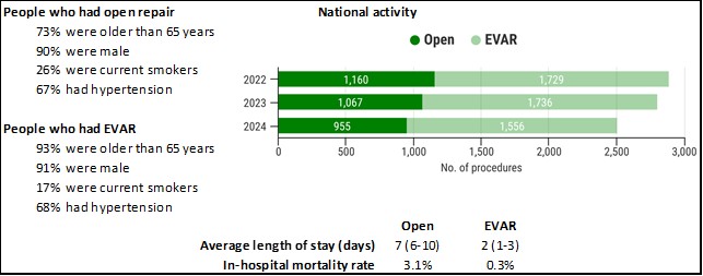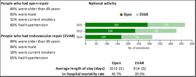 In 2024, 46% of people with ruptured AAA had an EVAR procedure. Between 2022 and 2024, there was variation across units in the proportion of procedures performed as EVAR, with around a third of units performed more EVARs than open repairs for ruptured AAA. There may be potential in expanding the use of EVAR for ruptured AAA.