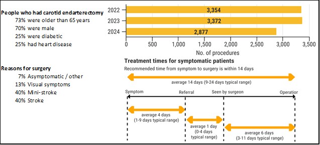 A carotid endarterectomy (CEA) is performed to remove plaque that has built up within the carotid arteries (the main vessels that supply blood to the brain, head and neck), with the aim of reducing the risk of stroke. It is performed in people who have recently experienced symptoms, but it can also be performed in people with no symptoms when the carotid arteries are partially blocked. Symptomatic patients made up around 95% of the CEAs performed in the UK during 2024.
