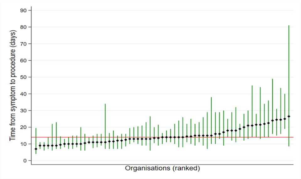 | Figure 13: Variation across NHS organisations in median times from symptom to procedure for CEA performed between January and December 2024. The black dot gives the median delay, while the green lines show the interquartile range. The red line shows the national target of 14 days. ![]() |