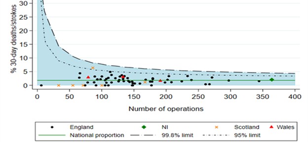 | Figure 14: Risk-adjusted rates of stroke / death within 30 days for NHS organisations that performed carotid endarterectomy (2022 to 2024). The national average in these years was 1.8% ![]() |