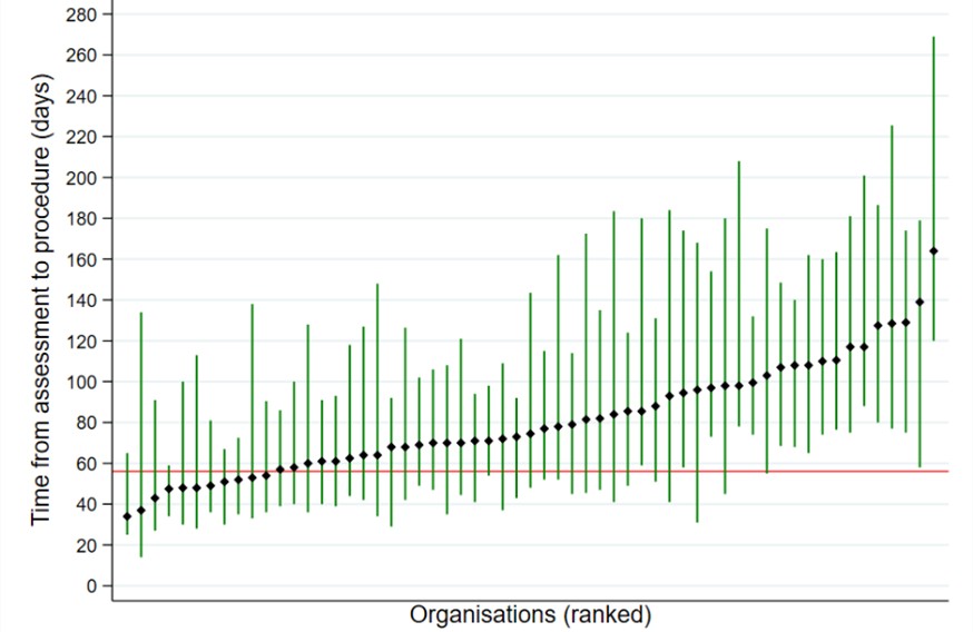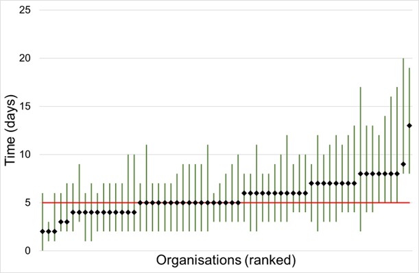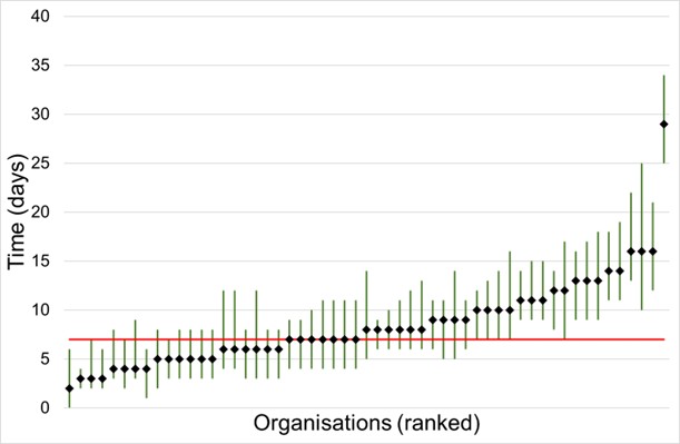 Figure 5: Variation in the time from vascular assessment to major amputation in 2024 among NHS organisations. The black dots are the median number of days, while the green line shows the interquartile ranges. The red line is 7 days.![]() |