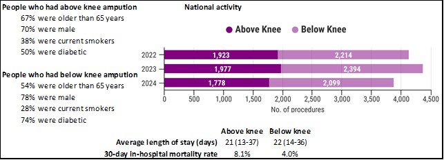 The overall rate of 30-day in-hospital death for major lower limb amputations in 2024 was 5.9%. As expected, it was higher for AKA (8.1%) than BKA (4.0%).