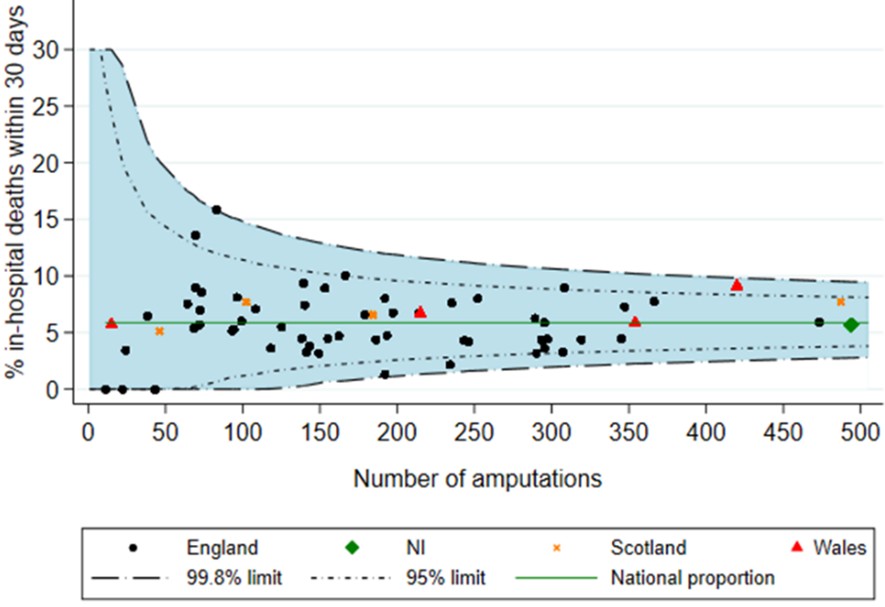 Figure 6: Risk-adjusted 30-day in-hospital death rate following major amputation for procedures between January 2022 and December 2024. Overall 30-day in-hospital mortality rate was 5.9%![]() |