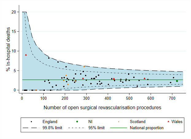In the NHS vascular units that performed bypass / open procedures, the adjusted postoperative in-hospital mortality rates fell within the expected range given the volume of cases performed (national average = 2.7% for 3 years from 2022 to 2024).